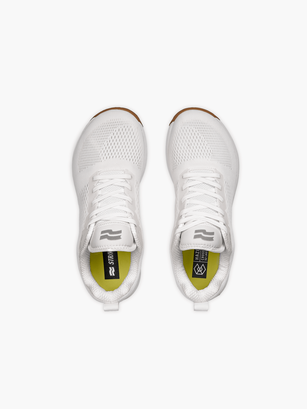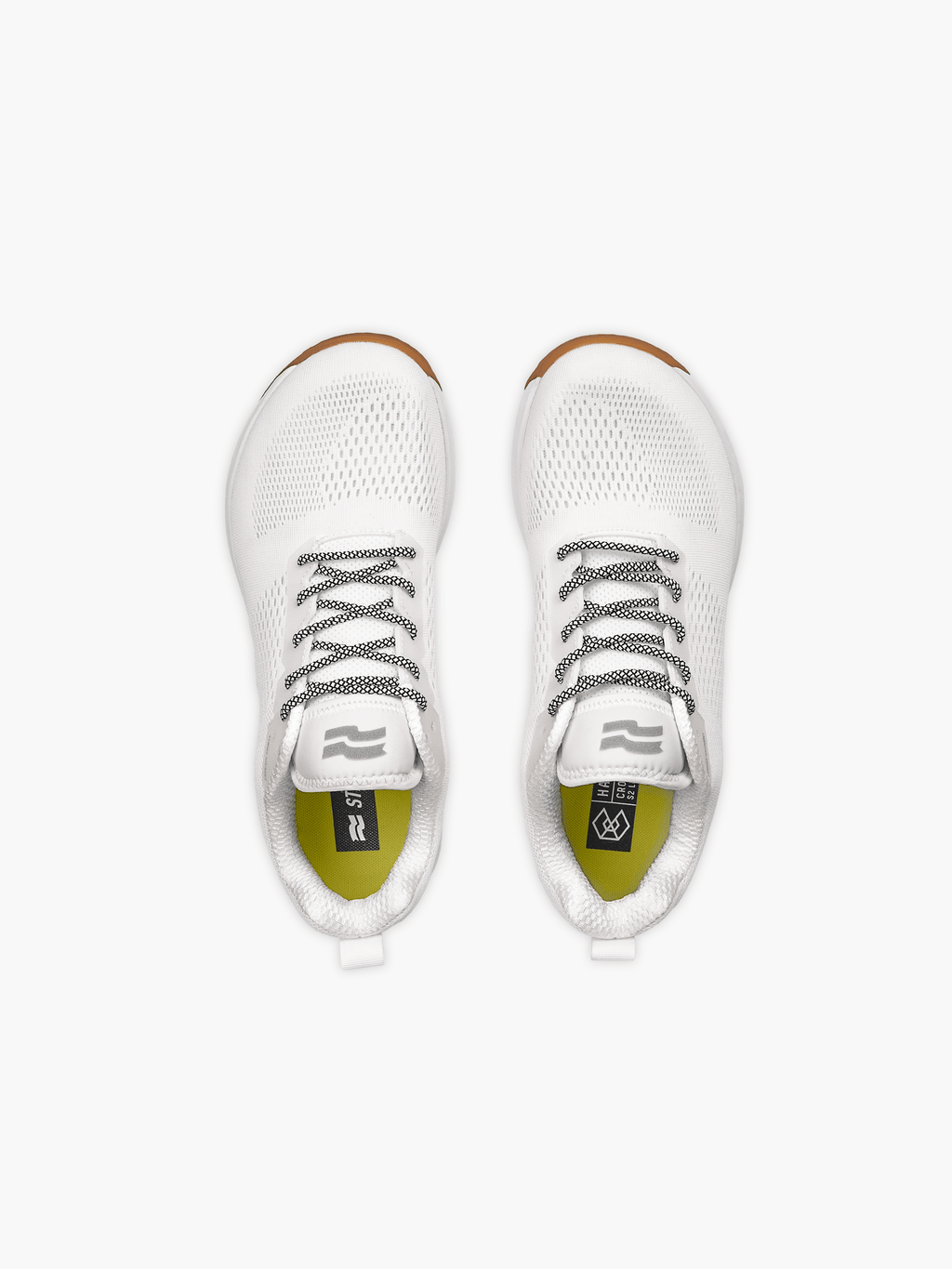 This Crisp White colorway with gum rubber outsole features reflective silver STRIKE MVMNT flag logo for visibility when on the move. Comes with two sets of shoelaces – black/ white woven and classic white.