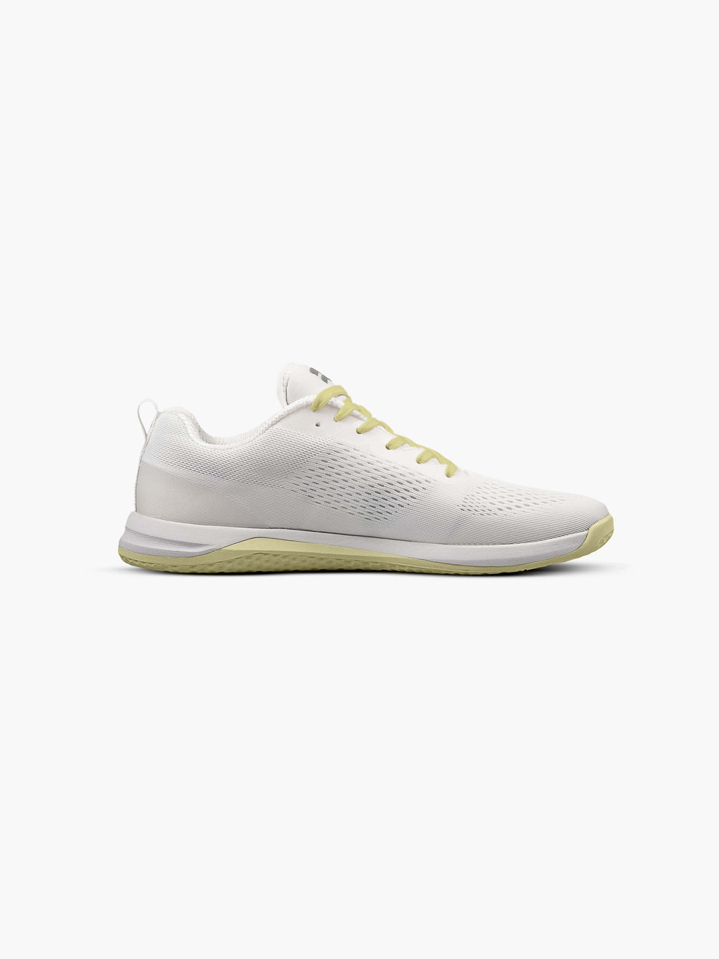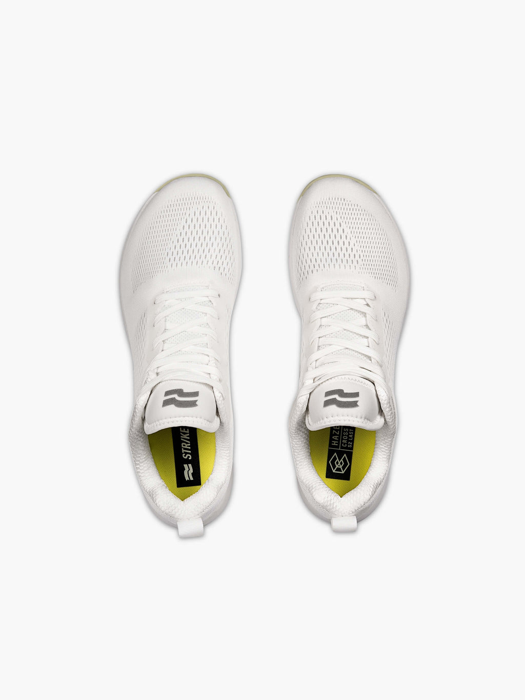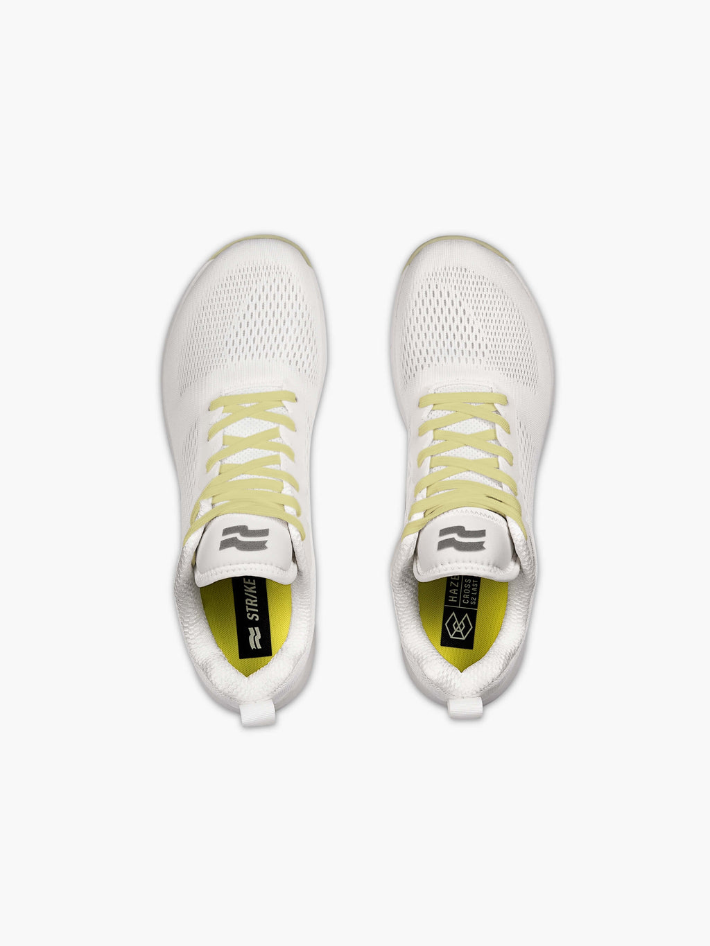 This Crisp White colorway features reflective silver STRIKE MVMNT flag logo for visibility when on the move. Comes with two sets of shoelaces – mellow yellow and classic white