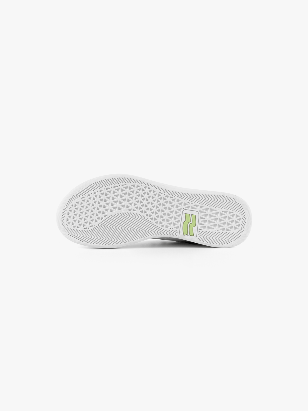 Freessh. A chalk white upper with a pop of neon green and reflective silver flag logo on tongue.