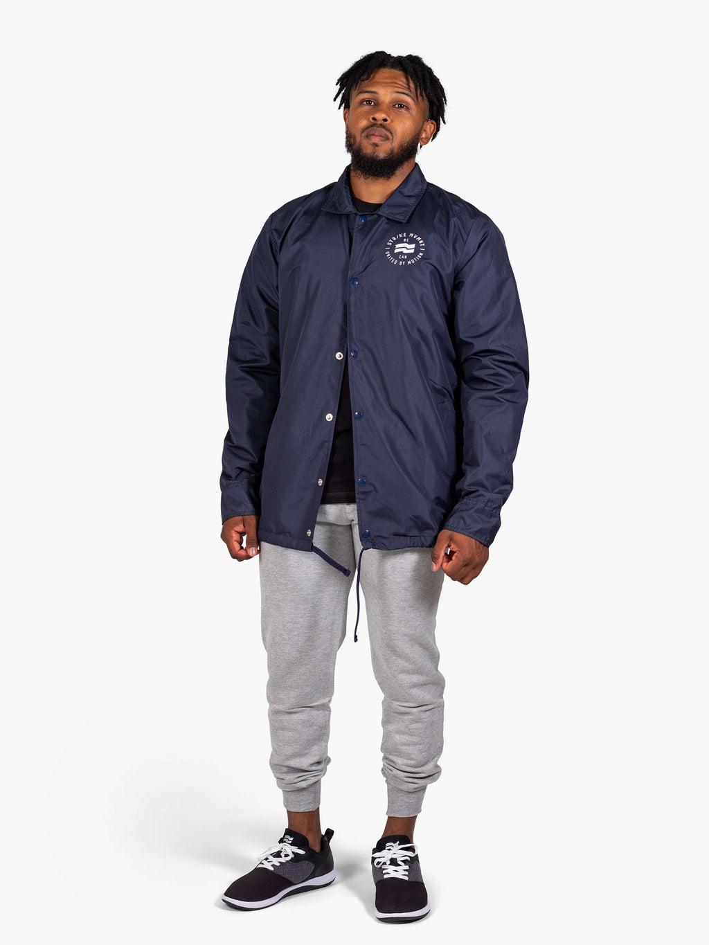 The United By Motion® Coaches Jackets. A throwback piece that will move you forward through crisp mornings and post workout cool downs. Velvety nylon, soft cotton linings, oversize draw cords and custom labeling clinches the win.