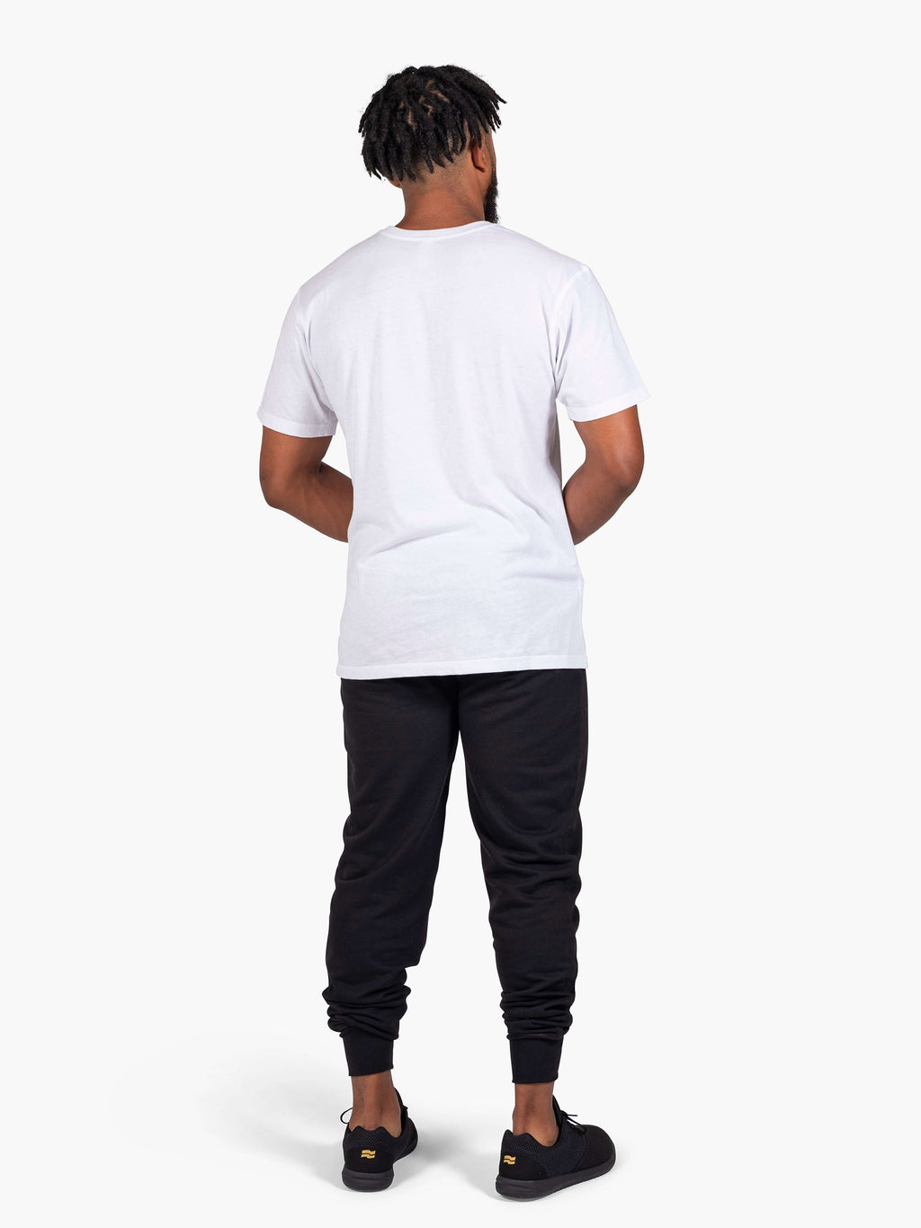 Athlete is 5'8" and 175 lbs and is wearing a size medium Timeless Tee. Shown with Mobil Sweatpants and the Chill Pill Transit AF Trainers.