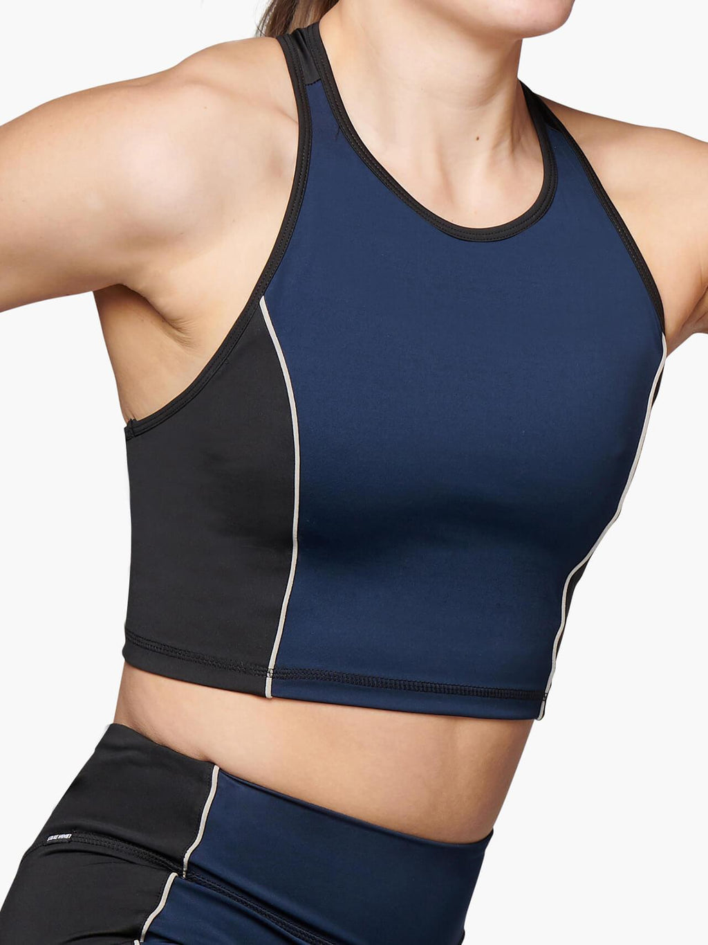 - Racerback design allows for a natural range of motion. High neckline keeps things in check.