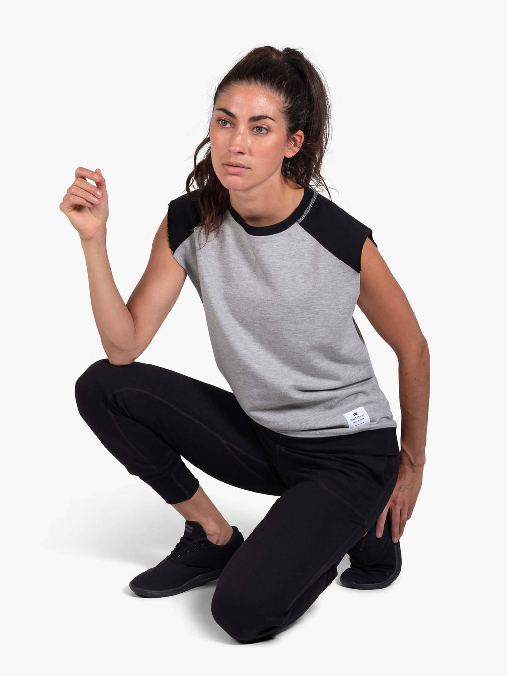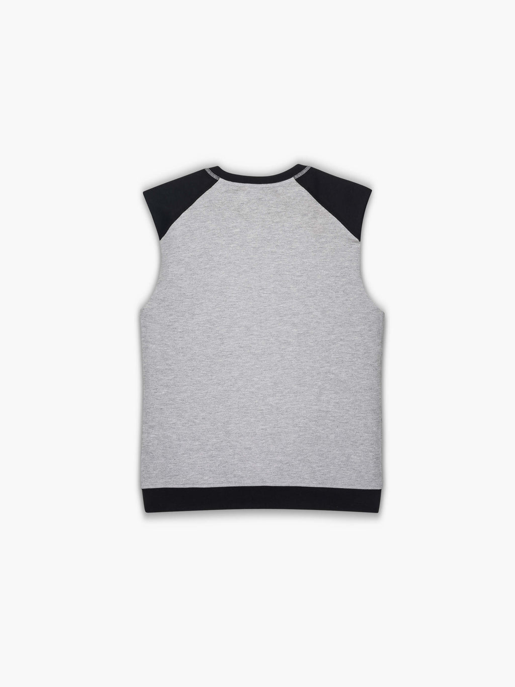 Sleeveless crewneck sweatshirt with raw edge arm openings. Keeps your core warm but with total upper body mobility and unrestricted range of motion.